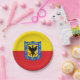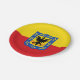 Paper plate with design with flag of Bogota, capital city of Colombia, red and yellow flag with coat of arms with eagle in the centre