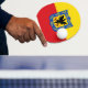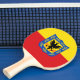 Ping pong paddle with design with flag of Bogota, capital city of Colombia, red and yellow flag with coat of arms with eagle in the centre