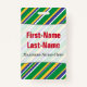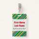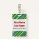 This badge design features a pattern of stripes (or lines) of various widths, colored green, yellow, blue or white. These colors were inspired by those of the national flag of Brazil. It also features a personalized name in red colored text within a light colored area. There is also a custom message under the name that could show information such as a job role name, or a profession, or a business/company name. [~Z0000176]