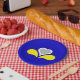 Paper plate with design with flag of Brussels-Capital Region of Belgium, blue flag with yellow, grey and white iris