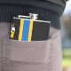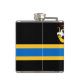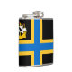 Vinyl wrapped flask with design with a flag of historic county of Caithness, in Scotland, Great Britain; black flag with blue and yellow Nordic cross and an illustration of a ship with a raven on its sail in the upper hoist