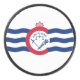 Hockey puck with flag of city of Cincinnati, Ohio; white flag with three blue waves with red “C” in the center