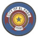 Hockey puck with flag of city of El Paso, Texas; blue flag with seal of the city