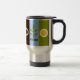 Travel Mug with flag of Fresno, California, flag with three vertical bands of brown, blue and green, with stylised illustrations of cog, plant and sun