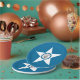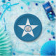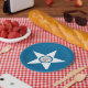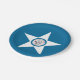 Paper plate with flag of Houston, Texas; blue flag with seal of Houston in a white star, with an illustration of a train