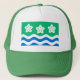 Hat with design with a flag of historic county of Cumberland, in England, Great Britain; green flag with three Parnassus flowers and white and blue waves
