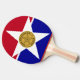 Ping pong paddle with flag of city of Dallas, Texas; flag with red and blue horizontal bands with seal of the city inside of a white star in the centre