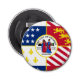 Button bottle opener with flag of city of Detroit, Michigan; red, white and blue flag with stars and stripes, fleur-de-lys, dragons and seal of the city