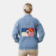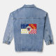 Denim Jacket with flag of city of Detroit, Michigan; red, white and blue flag with stars and stripes, fleur-de-lys, dragons and seal of the city