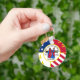 Button Keychain with flag of city of Detroit, Michigan; red, white and blue flag with stars and stripes, fleur-de-lys, dragons and seal of the city