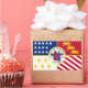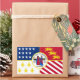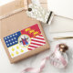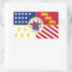 Sticker with flag of city of Detroit, Michigan; red, white and blue flag with stars and stripes, fleur-de-lys, dragons and seal of the city