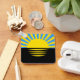 Square keychain with the flag of Donetsk Oblast (Donetska oblast, Доне́цька о́бласть), a blue, yellow, and black flag with a rising gold sun and 12 sunbeams