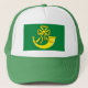 Hat with design with design with a flag of historic county of Huntingdon, in England, Great Britain; green flag with a gold ribboned hunting horn