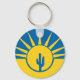 Button Keychain with flag of city Mesa, Arizona; yellow and blue flag with stylised illustrations of desert, cactus and rising sun