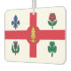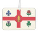 Air Freshener with the flag of Montreal, the most populous city in the province of Quebec, Canada. A white flag with a red cross, a white pine, a blue Fleur-de-lys, a red Rose of Lancaster, a shamrock, and a thistle