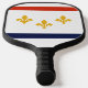 Pickle ball paddle with flag of city of New Orleans, Louisiana; white flag with red and blue stripes and three golden fleur-de-lys