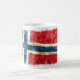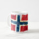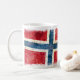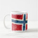 This item has the Norwegian flag in a distressed style that is at a slight angle. The flag is cropped in a horizontal bar with dissolved edges. The flag of Norway is red with a blue Scandinavian cross outlined in white that extends to the edges of the flag.