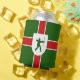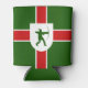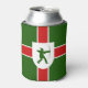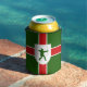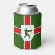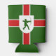 Can cooler with design with a flag of historic county of Nottinghamshire, in England, Great Britain; green flag with a red cross, with inescutcheon with illustration of Robin Hood in the centre