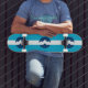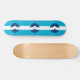 Skateboard with a design with the flag of Ogden, Utah. A blue and white flag with mountain peaks in the centre