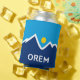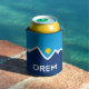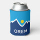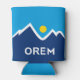 Can Cooler with a design with the flag of Orem, Utah. A blue, white, and yellow flag with mountain peaks and the sun in the centre
