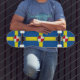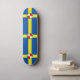 Skateboard with design with a flag of historic county of Pembrokeshire, in Wales, Great Britain; blue azure flag with a yellow cross and white Tudor rose in the centre