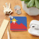Keychain with a design with the flag of Pocatello, Idaho. A blue flag with red mountains and a yellow star