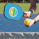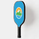 Pickleball Paddle with a design with the flag of Provo, Utah. A blue flag with the Provo City logo in the centre. The logo represents the Utah lake and nearby mountain peaks with the rising sun in the background