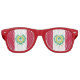 Sunglasses with flag of city of Raleigh, North Carolina; flag with three vertical bands of red and white with city’s seal in the centre