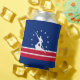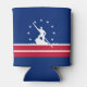 Can Cooler with flag of city of Richmond, Virginia; blue flag with red and white stripes, with white stripes and silhouette of man working James river bateau down the James river