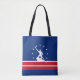 Tote bag with flag of city of Richmond, Virginia; blue flag with red and white stripes, with white stripes and silhouette of man working James river bateau down the James river