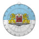 Dartboard with design with flag of Riga, capital city of Latvia; white and blue flag with coats of arms with two golden lions holding a shield in the centre