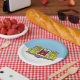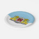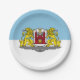Paper Plate with design with flag of Riga, capital city of Latvia; white and blue flag with coats of arms with two golden lions holding a shield in the centre