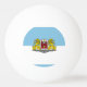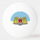 Ping pong ball with design with flag of Riga, capital city of Latvia; white and blue flag with coats of arms with two golden lions holding a shield in the centre