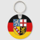 Button Keychain with flag of Saarland; design with horizontal tricolor of black, red and yellow (golden), with state’s coat of arms in the center