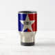 Travel Mug with the flag of San Antonio, Texas. A blue and red flag with white star and an illustration of Alamo in the middle