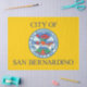 This design features the city flag of San Bernardino, which is a city located in the Inland Empire region of Southern California. The city serves as the county seat of San Bernardino County, California. It is located on the floor of the San Bernardino Valley to the south of the San Bernardino Mountains.