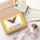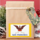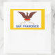 Sticker with flag of city of San Francisco, California; white flag with yellow border with an illustration of a phoenix rising from flames