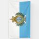 This design features the national flag of San Marino (officially the Republic of San Marino), which is a microstate in Southern Europe completely enclosed by Italy. San Marino is located on the northeastern side of the Apennine Mountains. Its capital is the City of San Marino and its largest settlement is Dogana. The capital is set at the highest point of the country on a steep mountain. San Marino's official language is Italian, however, Romagnol is the historical language of the region and still exists in a non-official capacity.