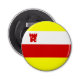 Button bottle opener with flag of city of Santa Barbara, California; flag with vertical tricolor of white, red and yellow, with illustration of a red fort in the upper left corner