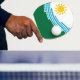 Ping Pong Paddle with a design with the flag of Spokane, Washington. A white and green flag with blue lines symbolising the Spokane river and Spokane Falls and a yellow sun