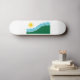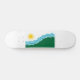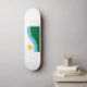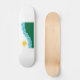 Skateboard with a design with the flag of Spokane, Washington. A white and green flag with blue lines symbolizing the Spokane river and Spokane Falls and a yellow sun
