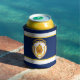 Can Cooler with the flag of Springfield, Massachusetts. A blue flag with a yellow and white outline and the illustration of the statue of Augustus Saint Gaudens in the centre