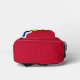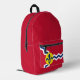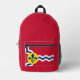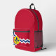 Backpack with flag of city of St. Louis; red flag with white and blue waves and blue fleur-de-lys in yellow circle