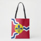 Tote bag with flag of city of St. Louis; red flag with white and blue waves and blue fleur-de-lys in yellow circle