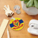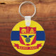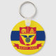 Button Keychain with flag of city of St Paul, Minnesota; flag with three horizontal stripes of blue and yellow with red emblem in the centre