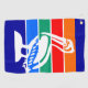 GolfTowel with a design with the flag of St. Petersburg, Florida. A flag with orange, red, green, blue, and navy blue stripes with a symbol of white pelican