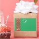 The flag of Turkmenistan (Russian: Флаг Туркмении,Turkmen: Türkmenistanyň baýdagy) was adopted on January 24, 2001. It features a green field with a vertical red stripe near the hoist side, containing five carpet guls (designs used in producing rugs) stacked above two crossed olive branches similar to those on the flag of the United Nations; a white waxing crescent moon, typical of Turkic symbology, and five white five-pointed stars appear in the upper corner of the field just to the fly side of the red stripe.