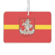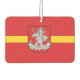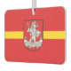 Air Freshener with design with flag of Vilnius, capital city of Lithuania; red flag with yellow stripe and coats of arms with two golden lions holding a shield in the centre
