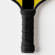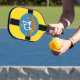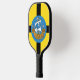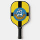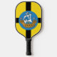 Pickleball Paddle with a design with the flag of Wellington City, New Zealand. A yellow flag with a black cross and the seal of the city with an image of a ship in the centre