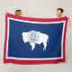 This design features the state flag of Wyoming, which is a doubly landlocked state in the western United States. It is the second most sparsely populated state in the country. Wyoming is bordered to the north by Montana, to the east by South Dakota and Nebraska, to the south by Colorado, to the southwest by Utah and to the west by Idaho and Montana. The official nickname of Wyoming is "Equality State", but it is also sometimes known as "Cowboy State" or "Big Wyoming". Wyoming's western half is mostly covered by the ranges of the Rocky Mountains, while the eastern half of the state is high-elevation prairie called the High Plains. Yellowstone national park is partially in Wyoming and Grand Teton national park is entirely within the state. Cheyenne is the state capital and the most populous city of Wyoming. The flag of the state of Wyoming includes a silhouette of an American bison. The red symbolises Native Americans and the blood of pioneers who gave their lives. The white is a symbol of purity and uprightness. The blue is the colour of the skies and distant mountains.